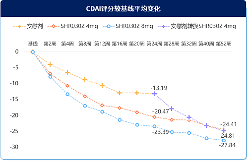 艾玛昔替尼治疗2周,可明显改善CDAI和SDAI。与安慰剂相比,SHR0302 4mg和8mg在第2周就显著改善患者CDAI和SDAI,且8mg组改善更好,持续改善至52周(图2)。