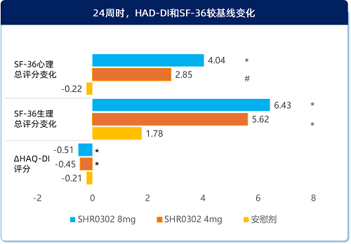SF-36评分数值变化越高,代表受试者获益越多;HAQ-DI数值变化越低,代表受试者获益越多